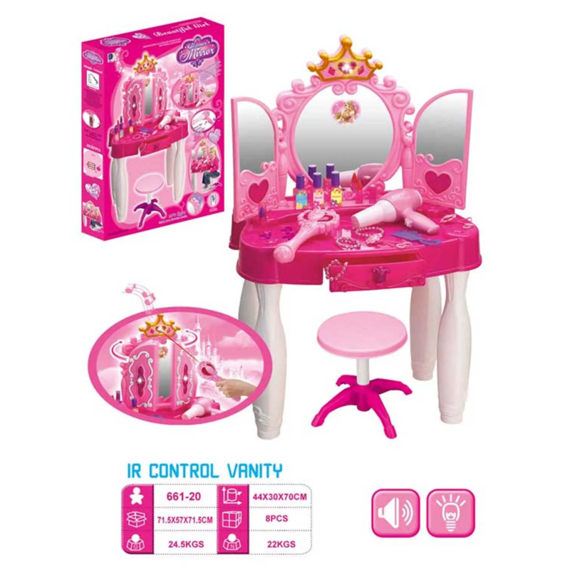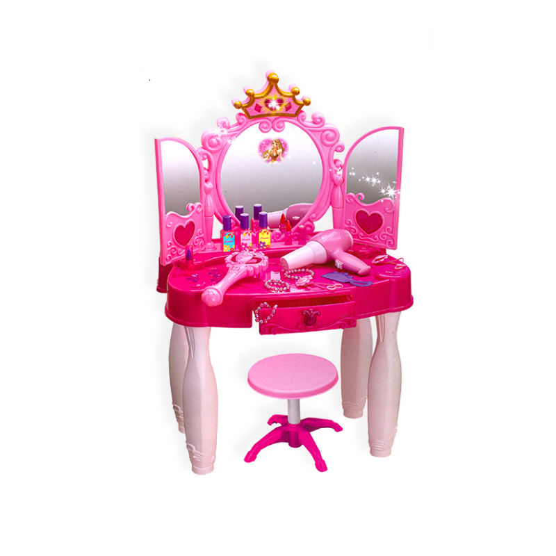 გოგონებისთვის განკუთვნილი საპარიკმახერო კომპლექტი სარკითა და სკამით: მაკიაჟის მაგიდა განათებით, ხმებით და თმის საშრობით GH-661-20
