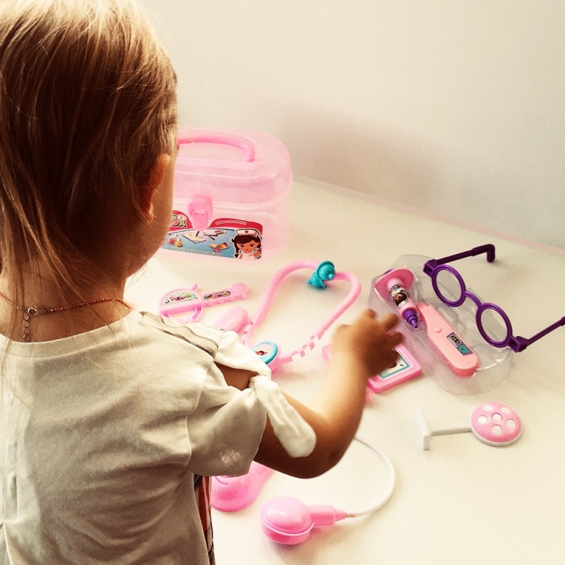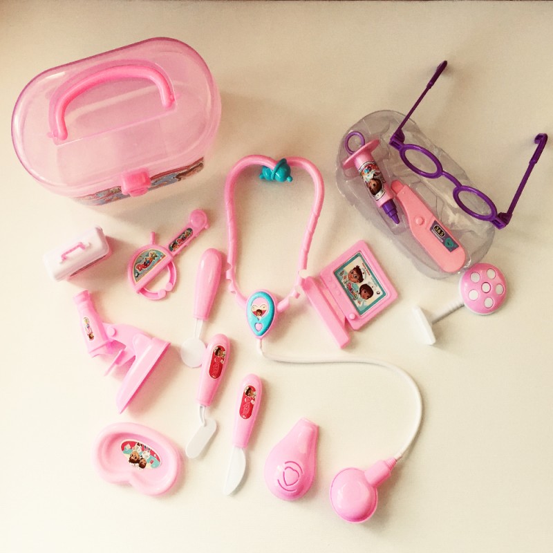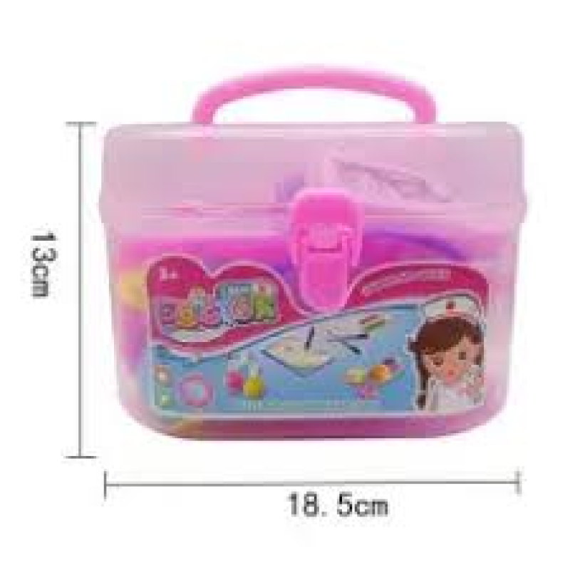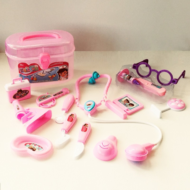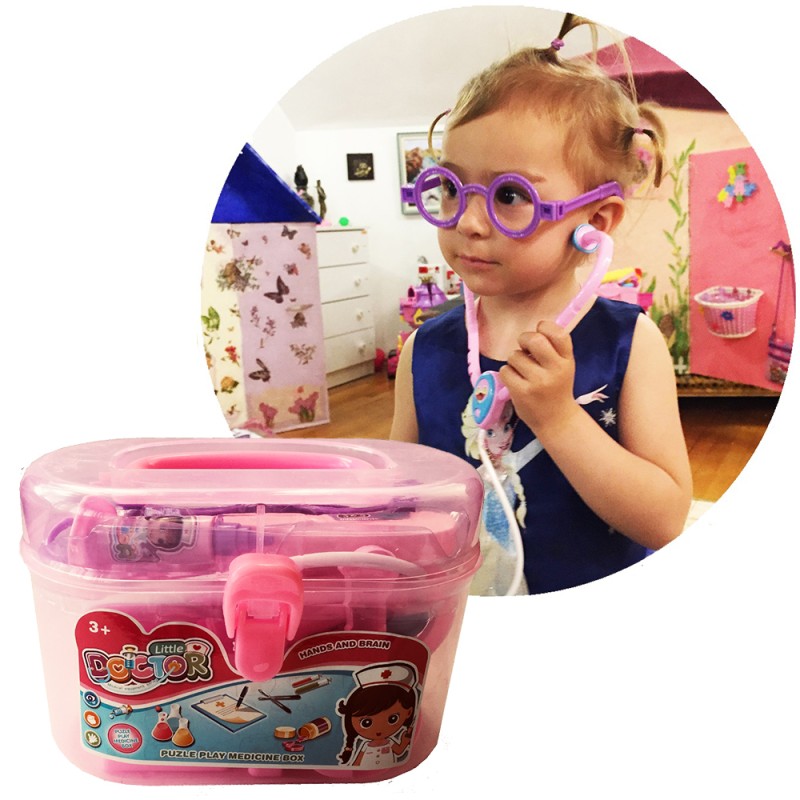 სამედიცინო ინსტრუმენტების ნაკრები მოთავსებულია ჩემოდანში – ვარდისფერი გოგონასთვის ან ლურჯი ბიჭისთვის.
