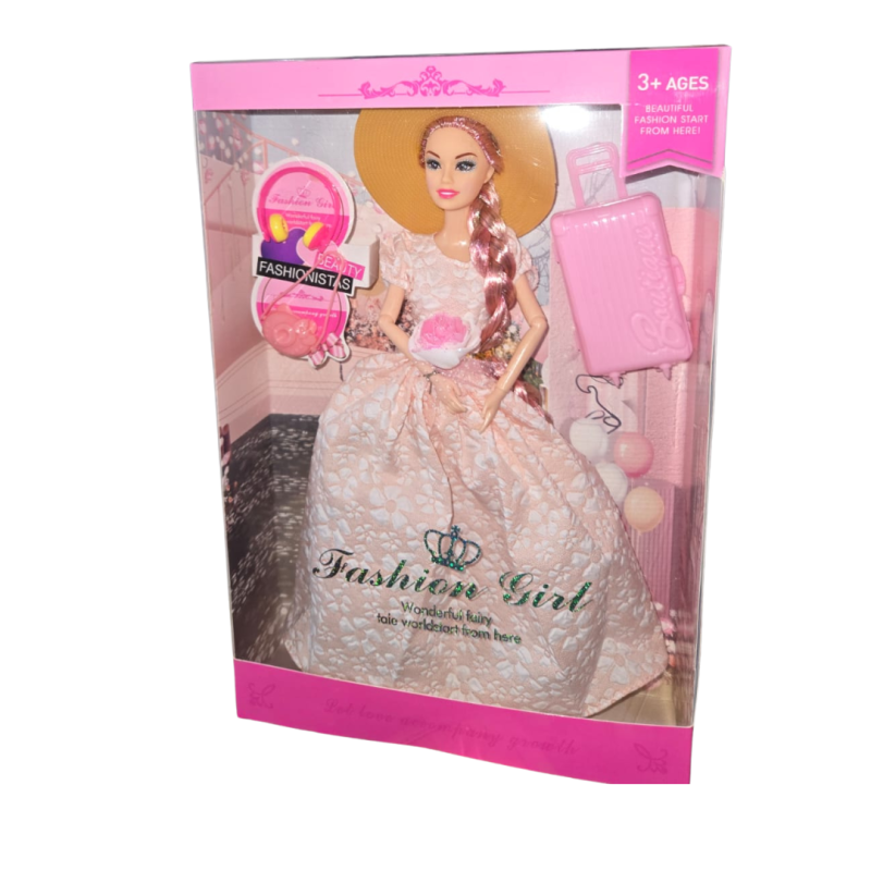 30 სმ-იან ვარდისფერ კაბაში გამოწყობილი დამატებითი თმით და აქსესუარებით მოდური თოჯინის აღწერა: