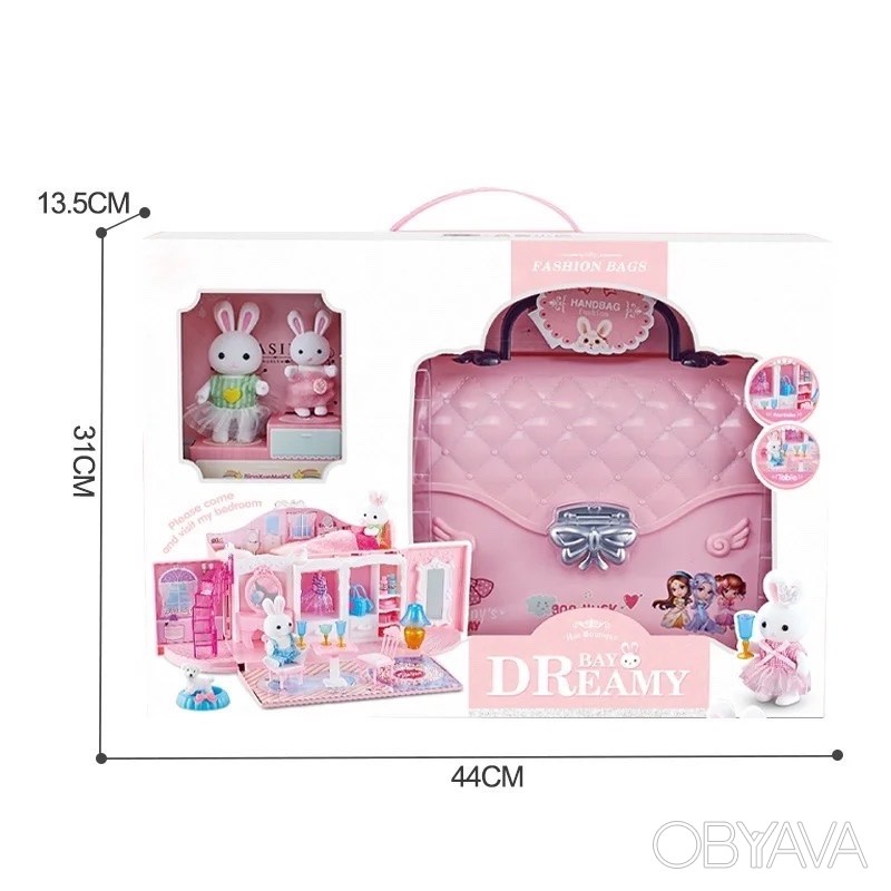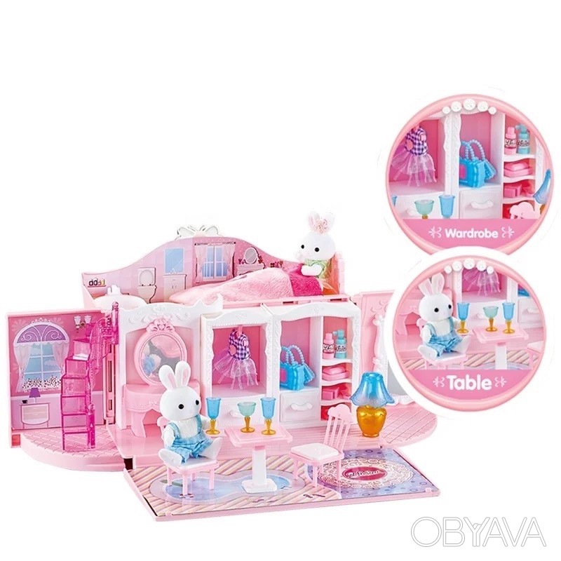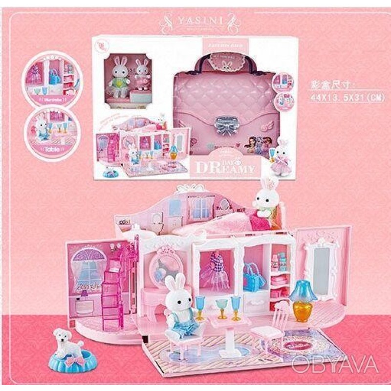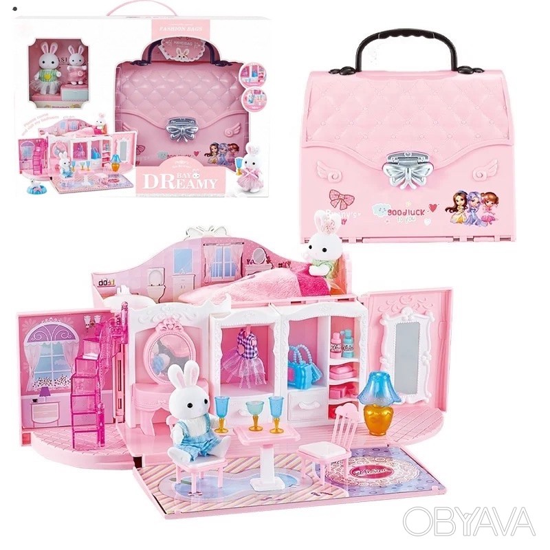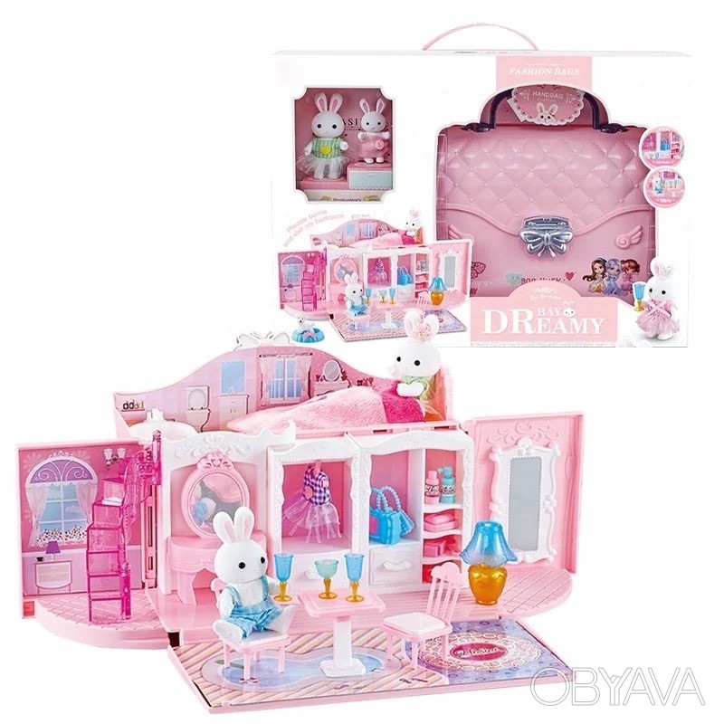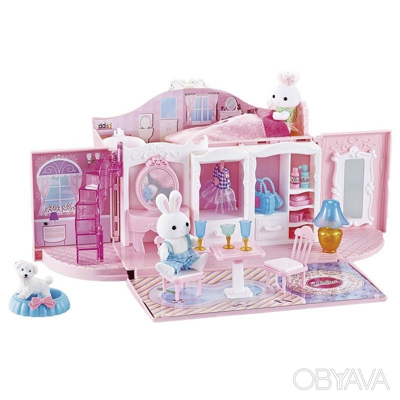 კაშკაშა სათამაშო კომპლექტი დამზადებულია გასახსნელი ჩანთის სახით, შიგნით არის ოთახები საჭირო ავეჯით. პირველ სართულზე არის გასახდელი ოთახი, ხოლო მეორე სართულზე არის აბაზანა და საძინებელი. თამაშის დროს გოგონას შეეძლება ავეჯის მოწყობა საკუთარი შეხედულებისამებრ და საკუთარი მომხიბვლელი ისტორიების მოფიქრება. თამაშის შემდეგ, სახლი ისევ ჩანთაში გადაიქცევა, ამიტომ ყველა ნაწილის მოწესრიგებულად შენახვა შესაძლებელია. ტარებისთვის გათვალისწინებულია სახელური. კომპლექტში შედის 2 კურდღლის ფიგურა.
